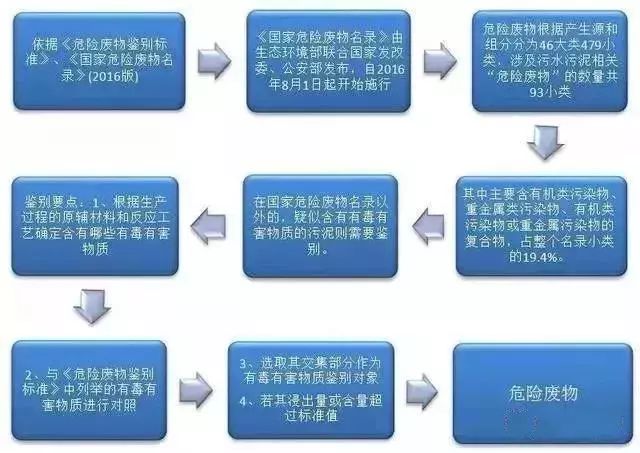 依據由環(huán)境保護部聯合國家發(fā)改委、公安部發(fā)布自2016年8月1日起開始施行的《國家危險廢物名錄》(公眾號內回復”危廢名錄“下載)和《危險廢物鑒別標準 通則》,結合住建部、環(huán)保部、科技部于2009年2月28日聯合發(fā)布的《城鎮(zhèn)污水處理廠污泥處理處置及污染防治技術政策(試行)》,五步即可判定污水污泥是否屬于危險廢物,如下圖所示: